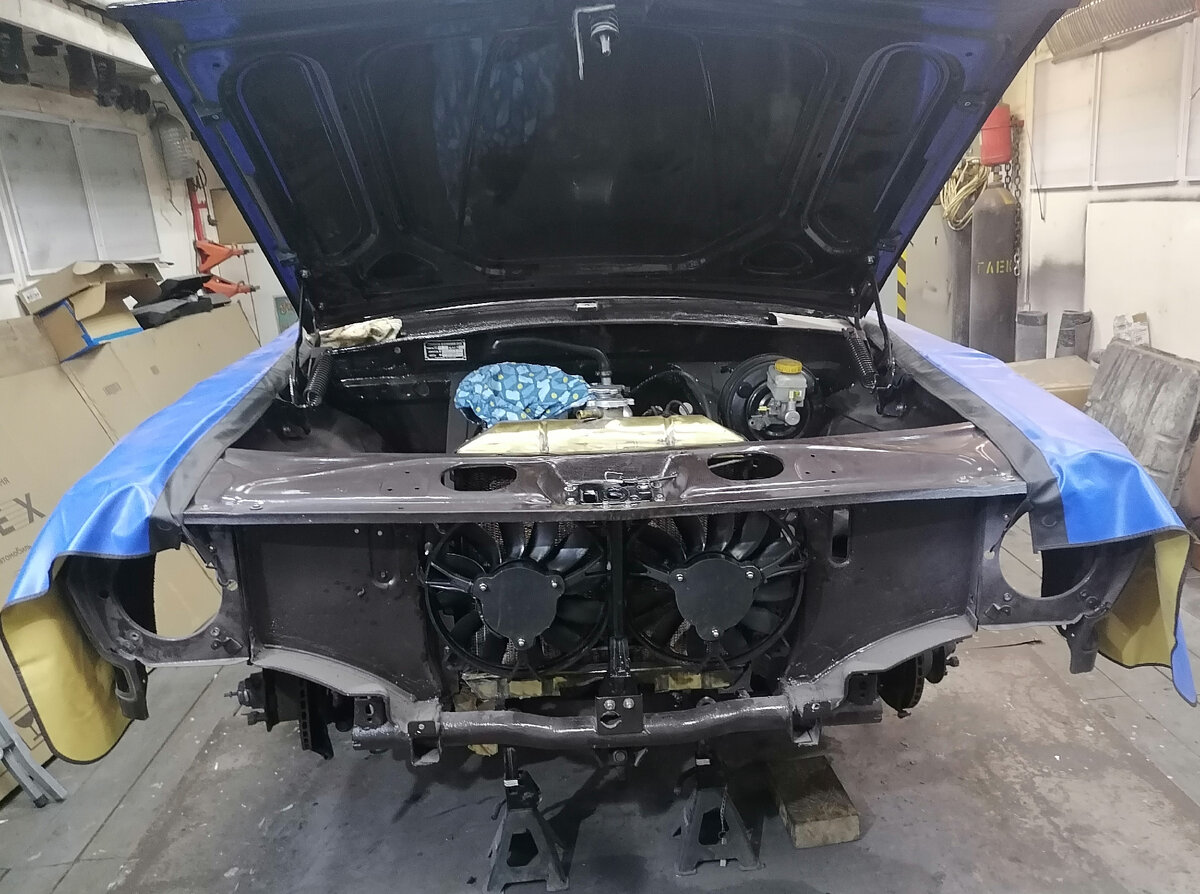 Приехал вентилятор - нештатный, от 21214 Нивы. Да, опять колхоз. Из плюсов здесь - больше места перед двигателем для доступа к шкивам и ремню; лучшее охлаждение за счет высоких оборотов вентилятора, да их еще и два; можно организовать последовательное включение, чтобы поменьше шуметь да напряжение в бортсети не просаживать. Из минусов - в музей за миллион машину уже не продать. К слову, все изменения обратимые.