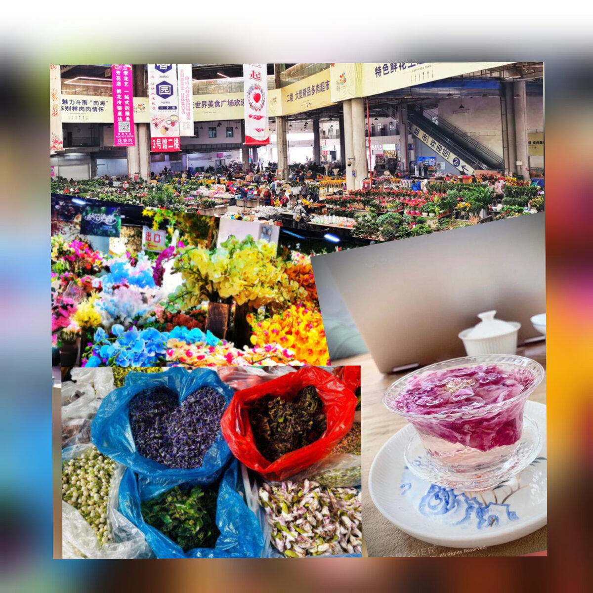 Название провинции можно перевести, как «Страна южнее облаков». Весна в этой провинции, как пишут, длится четыре раза в год. Не удивительно, что в пищу идут цветы. Кстати, и цветы чая, в том числе. Юньнань еще и чайная провинция. Говорят, что там растет чайное дерево, возраст которого превышает 1.7 тысяч лет. Знаменитый пуэр выращивают именно в Юньнани. Купить и чай, и цветы можно на самом крупном ночном базаре в Китае. Находится он в городе Цзинхун в округе Сишуанбаньна, площадь базара – 530 тыс. кв. м. Купить свежие и съедобные цветы можно в деревне Наньдоу у города Куньмин. Там находится крупнейший в Азии рынок торговли свежими цветами (представляете аромат?).