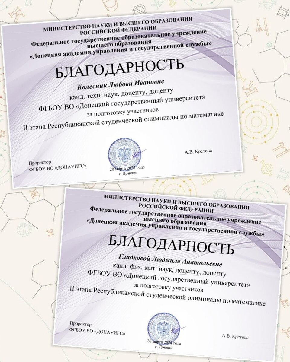 20 марта 2024 г. на базе Донецкой академии управления и государственной службы состоялся II этап Республиканской студенческой олимпиады по математике среди студентов 1 курса направлений подготовки 38.03.01 «Экономика» и 38.03.02 «Менеджмент». Целью проведения олимпиады является выявление и развитие способностей к математике, а также стимулирование математического творчества студентов. В олимпиаде приняли участие 24 студента из вузов ДНР, среди них: Донецкий государственный университет, Донецкий национальный технический университет, Донецкий национальный университет экономики и торговли имени Михаила Туган-Барановского, Донбасская национальная академия строительства и архитектуры, Донецкая академия управления и государственной службы, Донбасский государственный технический университет. Честь нашего университета отстаивали студенты экономического и учетно-финансового факультетов Подолянчук Илья (44.03.05 Педагогическое образование, профиль «География и обществознание»), Дубык София (38.0