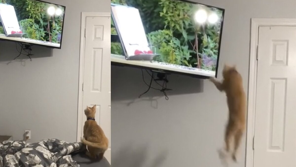 Питомец из этого видео как раз открыл охоту на птицу, которую увидел на экране телевизора. Кот приготовился к прыжку, но, кажется, не учел самого важного — что птица находится на экране, а еще… что телевизор подвешен высоко. Видимо, на случай таких прыжков от питомца. Поэтому кот в прыжке оттолкнулся от кресла и плюхнулся вниз. Птица и телевизор остались целы.