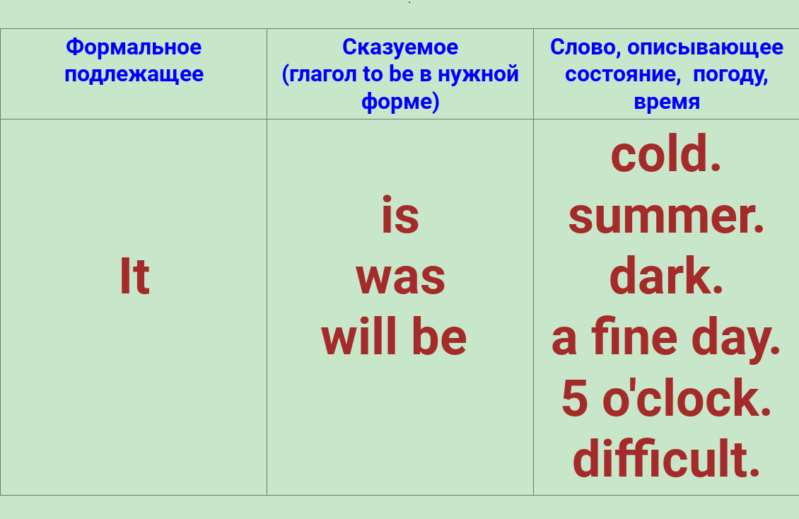 И ни в одном из них мы не наблюдаем того, кто мог бы выступить подлежащим. Поэтому мы добавляем формальное подлежащее «it» в начале каждого из этих безличных предложений. Но после подлежащего, согласно правилу порядка слов в английском предложении, мы обязаны использовать сказуемое, которое также отсутствует в наших примерах. Что делать? Мы снова сами добавляем сказуемое в виде глагола-связки «to be» в нужной форме – «is».