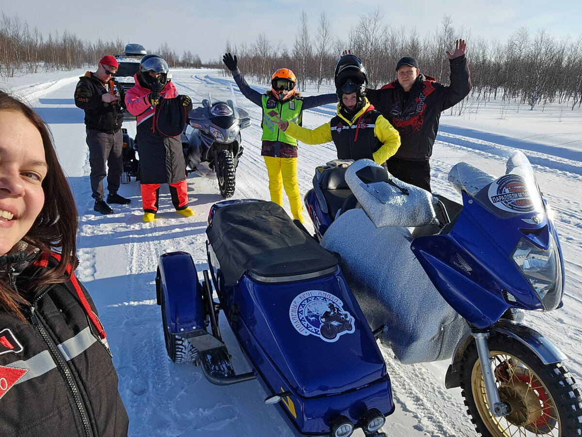 Мы медленно ехали по Красноселькупу колонной: пикап с маячками, два мотоцикла и внедорожник. Девчонки аккуратно вели мотоциклы. Но в коляске было намного старшнее, чем за рулем. Особенно, после инструктажа, в котором Виталик пассажиру в любой нештатной ситуации обещал ... в общем, ничего хорошего. Ехать в таком состоянии было невозможно и я отпустила ситуацию. Доверилась Ирине на 111%. Уже на зимнике в правые повороты она начала мне говорить, что мне надо сдвинуться. Так как шлемы были закрытые и толком не было слышно, я поняла сама, что она хочет. Ибо, гонки на колясычах все из нас видели и понимали некоторую механику. Поэтому в правых поворотах я смещала вес на колесо. На середине первого нашего отрезка мы решили поменяться. Теперь за рулем было страшно только из-за пассажира. Я не могла подвести подругу и вела мотоцикл аккуратно. Все шло прекрасно: начиная от погоды до управления техникой. От страха, который утром меня преследовал, почти не осталось следа. Затем Неместный останови