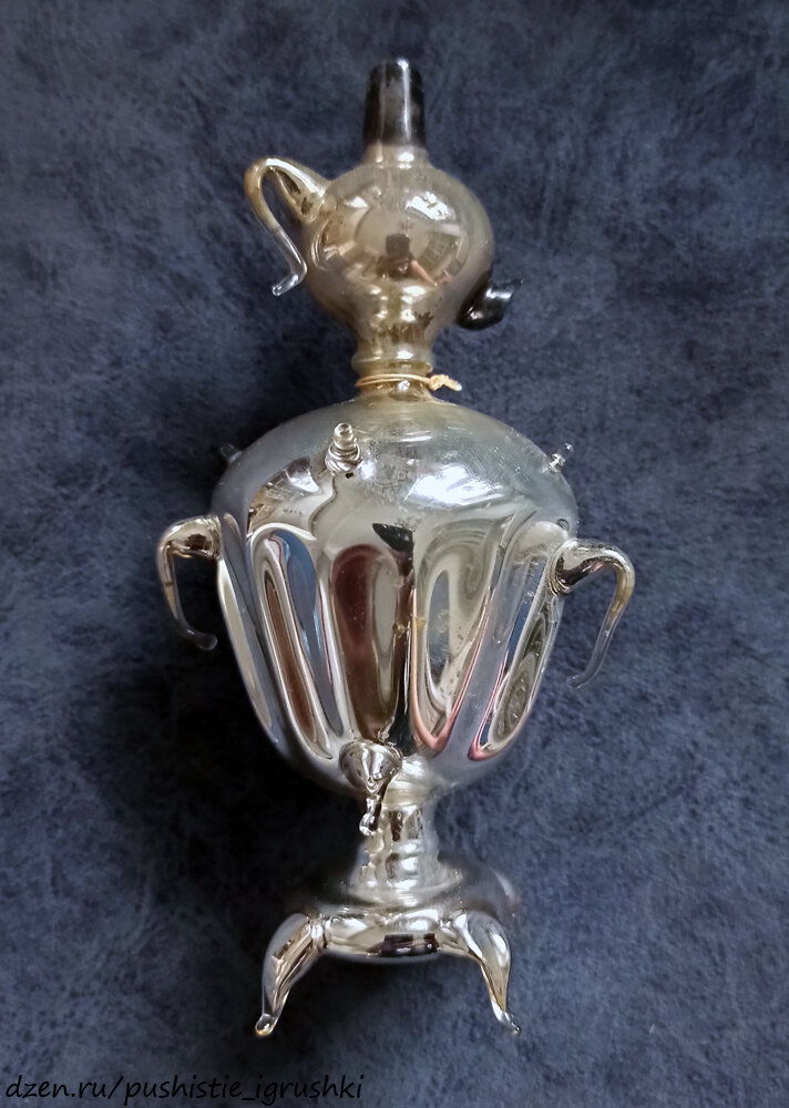 Продолжаю тему восстановления самоваров. Напомню, что я коллекционирую стеклянные елочные самовары. Но в силу хрупкости и старости этих елочных игрушек, они очень часто попадаются в подбитом виде. У этого шикарного экземпляра интересная судьба. Я его нашла на авито, но продавец сначала не нашла его и даже сказала, что похоже выкинула его. Я очень расстроилась, так как по фото самовар выглядел отлично, кроме носика. Но спустя несколько месяцев я снова увидела это объявление, написала продавцу и оказалось, что самоварчик нашелся. Видимо - судьба ему быть у меня. Самовар приехал ко мне и состояние его действительно было практически идеальным, за исключением аккуратно отбитого носика на чайнике. Отсутствовал подвес, для подвешивания использовали сначала проволоку, которая засунута внутрь самовара. Она такая тугая и сильно расперта внутри, что достать я её не смогла, хотя пыталась по-всякому. И видимо, когда проволока отломалась у владельцев, они привязали к самовару ниточку, остатки кот