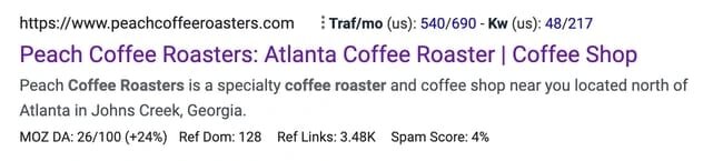 После того как вы выбрали ключевое слово, пришло время воплотить его в жизнь. Прежде всего, вы хотите вставить его в заголовок вашей веб-страницы. Заголовок страницы — один из самых важных параметров, по которым Google и другие поисковые системы определяют, что находится на веб-странице. Он отображается в верхней части результатов вашей веб-страницы на страницах результатов поисковых систем (SERP). Обратите внимание, как следующий бренд поместил ключевое слово «Atlanta Coffee Roaster» в заголовок своей страницы: