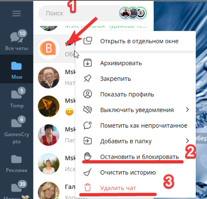 1. Нажмите на имя бота в списке контактов правой кнопкой мыши (если на телефоне, то нужно подержать палец на имени) откроется окошко с вариантами, как на картинке ниже.