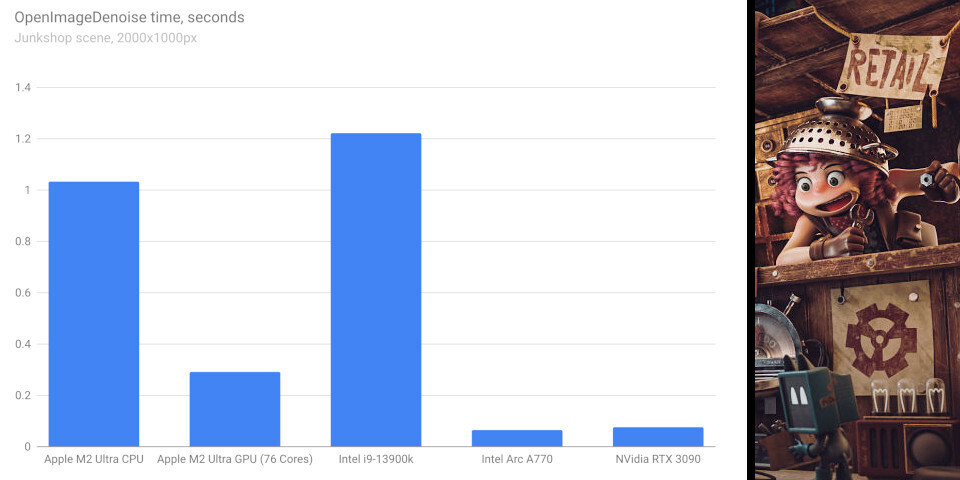 Главное изменение в Cycles - производственном движке рендеринга Blender, заключается в том, что теперь устранение шума рендера поддерживается на GPU при использовании Open Image Denoise (OIDN). Система устранения шума с открытым исходным кодом Intel изначально была предназначена только для CPU, но поддержка устранения шума на GPU появилась в OIDN 2.0, выпущенной в прошлом году. В отличие от существующей в Cycles системы GPU-обесцвечивания OptiX, OIDN не зависит от аппаратного обеспечения и поддерживается на процессорах NVIDIA, Intel и Apple Silicon, а поддержка AMD появится в Blender 4.2. Он также доступен на относительно старом оборудовании: поддерживаются карты серии NVIDIA GeForce GTX 16xx, выпущенные в 2016 году. Прирост производительности может быть весьма значительным: тестовая сцена Blender Junkshop выполняет устранение шума в 3 раза быстрее на Mac с процессором M2 Ultra на GPU по сравнению с CPU. Согласно примечаниям к выпуску, интеграция делает устранение шума "полного качества" доступным в 3D вьюпорте при интерактивной частоте кадров.