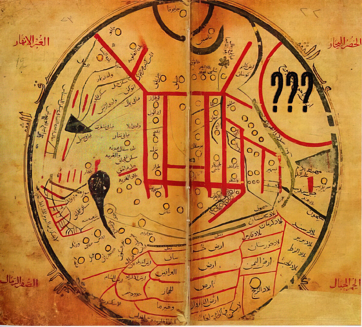 Простим древнего ученого, так как у них не было спутниковых снимков, и, скорее всего, при составлении карты, он опирался на истории купцов и путешественников, которые запросто могли немного запутаться. Давайте посмотрим на участок карты вокруг стены Зуль-Карная. Рядом мы видим следующие локации: Газна - это древний город в Афганистане, земли Индии - они несравнимо меньше по сравнению с теми, что мы имеем сейчас, Сырдарья - явная ошибка, так как эта река течет рядом с Ташкентом (может перевод неправильный), сам Кашмир, а также упоминается пустыня на востоке - это скорее всего Гоби.