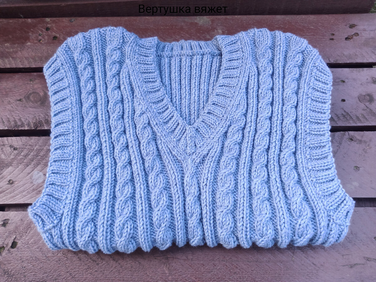 Помните комплект шоколадного цвета, состоящий из шапки и шарфа, который я вязала мужу, а подарила его маме? Я писала о нем вот тут: В общем носит его свекр. И носит он его с большим удовольствием. Должна признать, что и шапка, и шарф выглядят как новые, даже рисунок по-прежнему объемный. Вот тебе и Alize lanagold... 26 марта у свёкра был день рождения. В подарок я связала ему жилетку из уже проверенной Alize lanagold, в 100 граммах 240 метров, состав: шерсть 49%, акрил 51%, цвет 221 джинс. Жилетку сделала бесшовную. Сначала я набрала 208 петель, провязала 22 ряда резинкой 2х2. Вязала по кругу спицами #5. 23 ряд: *2 лицевые, 2 изнаночные, следующие 2 петли снимаем на доп.спицу и оставляем перед работой, 1 изнаночная, 2 петли с доп.спицы лицевыми, следующую петлю снимаем на доп.спицу и оставляем за работой, провязываем следующие 2 петли на основных спицах лицевыми, затем петлю с доп.спицы изнаночной, 2 петли с основной спицы изнаночными*. От * до * провязываем 7 раз, далее до конца ряд