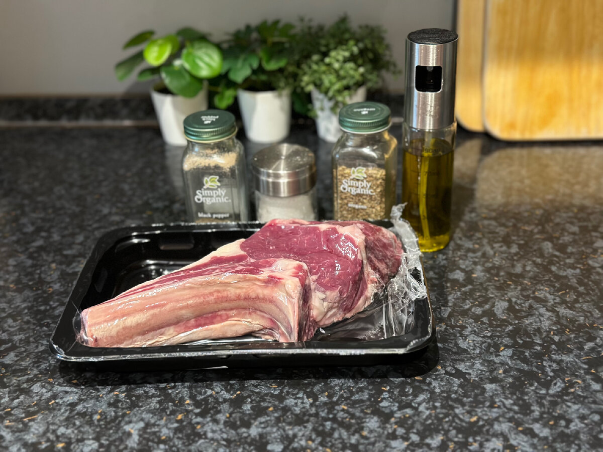 В своей недавней распаковке продуктов я делилась переживаниями по поводу стейка, который приобрела. Толстый кусок (около 5 см), к тому же на кости. Сначала я немного озадачилась, а потом поняла, что стоит рассказать, как же поступать с таким мясом, чтобы все получилось идеально. Тут же какая задача? Чтобы стейк с одной стороны не сгорел, а с другой - прожарился внутри до желаемого состояния (я предпочитаю medium). Стейк "Ковбой" - этот тот же рибай, только на кости (ребре). Для него используется часть говядины с толстого края спинно-реберной части туши. Один из самых сочных и ароматных стейков: мясо богато жировыми прожилками, а кость придает ореховый привкус. Рекомендуемая прожарка - medium. Спойлер: стейк у меня получился шикарный)) Итак, приступим. Ингредиенты Приготовление 1. Золотое правило для любого стейка: он должен быть комнатной температуры. Поэтому достаем мясо из холодильника заранее. 2. Ставим сковороду на максимальный огонь, а параллельно разогреваем духовку до 200 гр