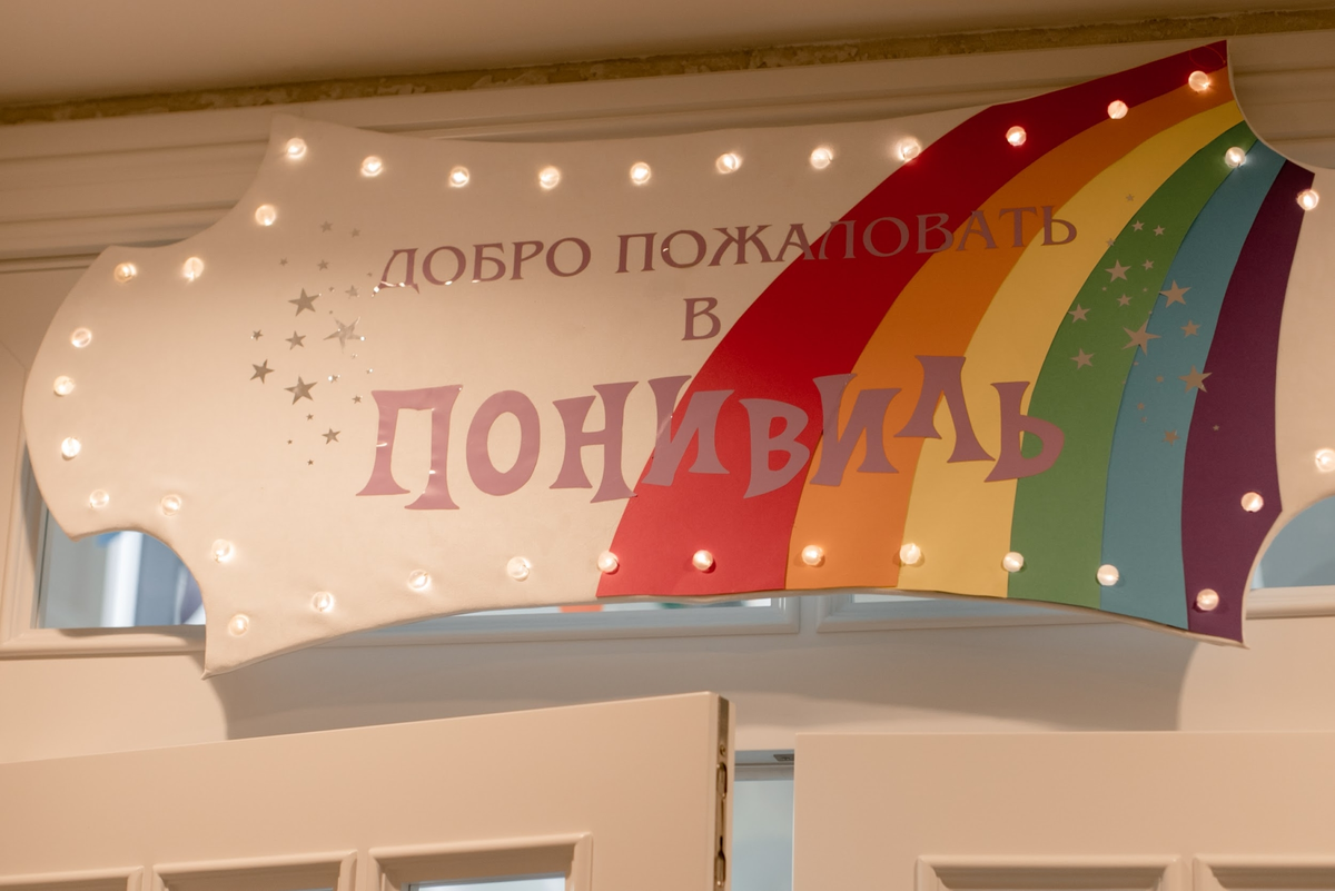 А дальше всех ждало волшебство и великолепие! Мы украсили каждый уголок — даже развесили облака из шаров под потолком, протянув между ними десятки метров флажков и ретро-лампочек. Так и получился сказочный Понивиль!