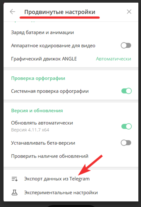 Откройте Настройки - Продвинутые настройки, в окошке пролистайте в самый низ и выберите Экспорт данных из Телеграм, как на картинке Выберите нужные пункты (какие чаты, медиа и т.д.), куда сохранить файл и оставьте формат HTML (этот формат можно открыть позже в любом браузере и просмотреть).