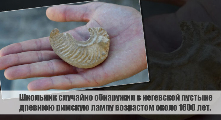 Йонатан Франкель, 16-летний школьник из города Ход Хаширон, случайно наткнулся на старинную римскую лампу в Негевской пустыне. Этот артефакт, которому уже более 1600 лет, оказался быстрой путешественницей в прошлое. Археологи определили, что эта лампа раньше использовалась в крепости Мезад Цафир.