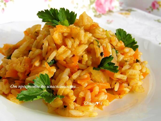 соль, перец, петрушка Приготовление: Лук обжарьте на растительном масле, добавьте натертую морковь. Тем временем отварите рис в воде до полуготовности. К овощам добавьте томатный соус. Затем рис, перемешайте. Готовьте под крышкой около 10 минут. Всыпьте базилик, посолите, поперчите, готовьте до мягкости риса. В конце добавьте рубленную петрушку, перемешайте и снимите с огня. Разложите блюдо по тарелкам, украсьте петрушкой и подавайте. Приятного аппетита! Вам также могут понравиться: