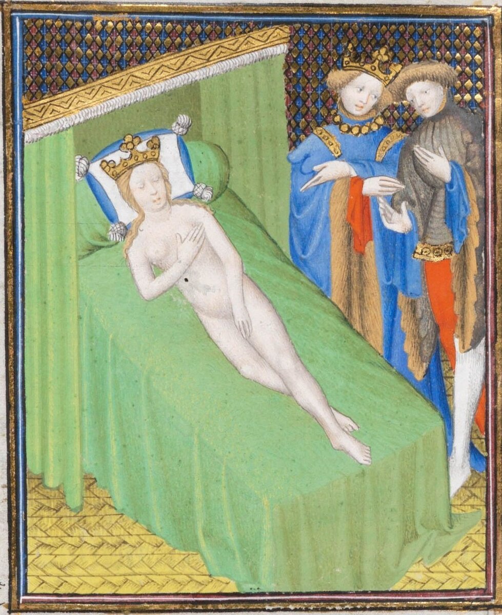 Тогда я стала искать сам источник иллюстрации - и нашла книгу, в которой он представлен. Она хранится в Женевской библиотеке и представляет собой сделанный примерно в 1400 году перевод работы Боккаччо на французский язык.