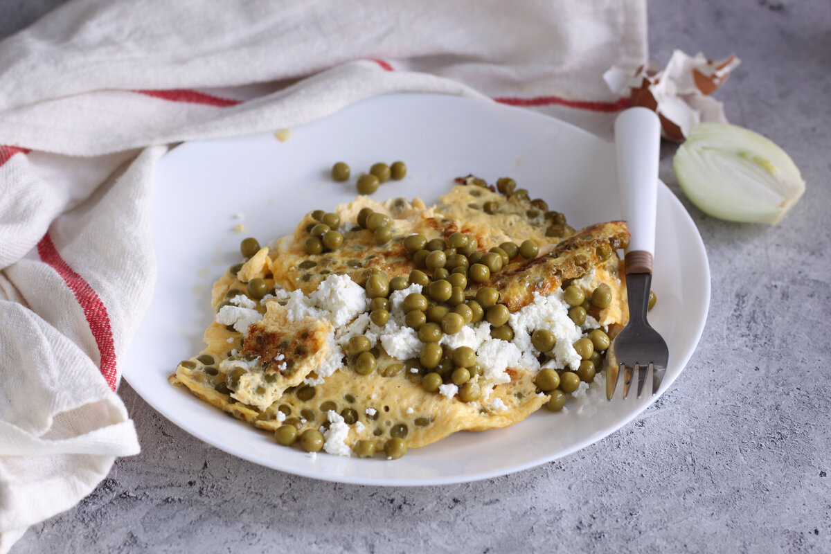 Готовый омлет выложить на тарелку, сверху выложить творог. Зеленый горошек - 50 г (консервированный или замороженный)
