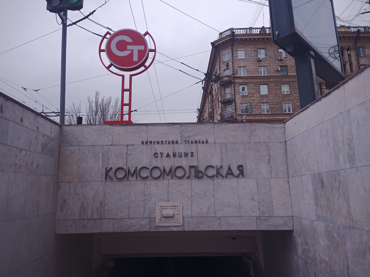В предыдущей статье я рассказал о станции Площадь Ленина и немного об истории создания волгоградской подземки. В этой статье речь пойдёт о следующей станции нашего метротрама - Комсомольской. Как и все станции первой очереди волгоградского метротрама, Комсомольская была открыта в 1984 году. Станция волгоградского метротрама «Комсомольская» расположена под сквером у пересечения проспекта им. В. И. Ленина с улицей Комсомольской и связана с подземным переходом через этот перекрёсток. Эта станция мелкого заложения колонного типа с тремя пролётами. Глубина заложения станции - 10 метров. Хотя станции такого типа называют «сороконожками» из-за большого числа колонн, на платформе «Комсомольской» их всего двадцать. Высота потолка посадочного зала — 4,7 метра от пола до рёбер покрытия. Строили станцию открытым способом, как и станцию "площадь Ленина". К сожалению, фото со строительства станции в свободном доступе практически нет. Нашёл только это: Сейчас прямо над станцией находится один из самы