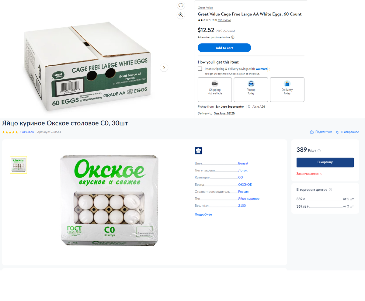 После анализа стоимости молока, давайте рассмотрим еще один важный продукт - яйца, и сравним их цены в России и США. Это позволит нам получить более полное представление о различиях в ценах и покупательской способности между этими двумя странами. В России за 30 яиц приходится заплатить 389 рублей. В США же за двойное количество яиц, то есть 60 штук, стоимость составляет 12,52 доллара. С учетом курса валюты (1 доллар = 93 рубля), переведем стоимость яиц в США в рубли. Таким образом, стоимость 60 яиц в США составляет примерно 1161,16 рубля (12,52 доллара * 93 рубля). Сравнивая стоимость яиц в обеих странах, мы видим, что даже при удвоенном количестве яиц цена в США все еще оказывается значительно выше, чем в России. Теперь давайте посмотрим, сколько яиц можно приобрести на минимальную заработную плату в обеих странах. В США минимальная заработная плата в день составляет 180 долларов. По цене 12,52 доллара за 60 яиц, это позволяет приобрести примерно 540 яиц за день (180 долларов / 12,52