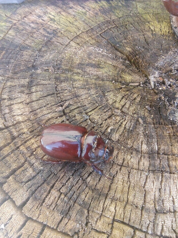 Сегодня решила наконец-то заняться вплотную огородными работами. Уже руки по земле соскучились, ей богу. Стала грядки готовить к посадкам. Одна грядка была ещё мёрзлая. На полштыка нормально, а дальше лёд - не копается. А вторая нормальная. Я её перерыла полностью. Блин, а врачи особо-то сказали не напрягаться, да и муж ругает. И поэтому я саперной лопаткой копала, сидя на скамейке переносной. Перекопать саперной лопаткой грядку в несколько квадратов, я вам скажу - это нечто! Это как ложками грести. Долго и муторно. Я ещё и навоз таскала маленькими ведёрками. Миллион рейсов. Одна грядка развалилась. Пришлось готовить её к починке. Завтра муж придет со смены, починит. Там только столбик заменить нужно. Доски-то ещё годок послужат. Случайно откопала вот такое существо. Он не шевелился. Я думала - дохлый. Хотела уткам дать. Положила на пенек, думаю - потом дам. А он отогрелся и пополз. Я его поснимала маленько и отпустила. Пусть живёт. Тем более какой-то редкий жук. Я раньше таких здесь н