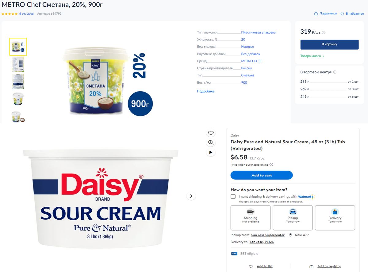 Продолжаем путешествие по ценам в России и Америке! Сегодня мы снова собираемся сравнить цены на продукты питания в двух странах - России и Соединенных Штатах Америки. На этот раз наш взгляд устремлен на сметану. Давайте посмотрим, как цены на этот продукт различаются между двумя странами! И кстати что самое интересное. Я думал перед переездом в США, что сметану тут найти проблемтично, что это так сказать "Диковенький" продукт, но мало того что сметана есть совершенно в любом магазине и ее миллион видов, так еще она и дико вкусная! Я реально никогда не ел такой вкусной покупной сметаны в Росиии, да конечно деревенская сметана не в какое сравнение не идет с американской, но магазинная Российская сметана как бы это смешно не звучала, проигрывает по всем статьям.... Вот такое вот удивление... В России стоимость 1 килограмма сметаны составляет 354,4 рубля. В то же время, в США цена за 3 фунта (примерно 1,36 килограмма) сметаны составляет 6,58 доллара. Для удобства сравнения цен, давайте пе
