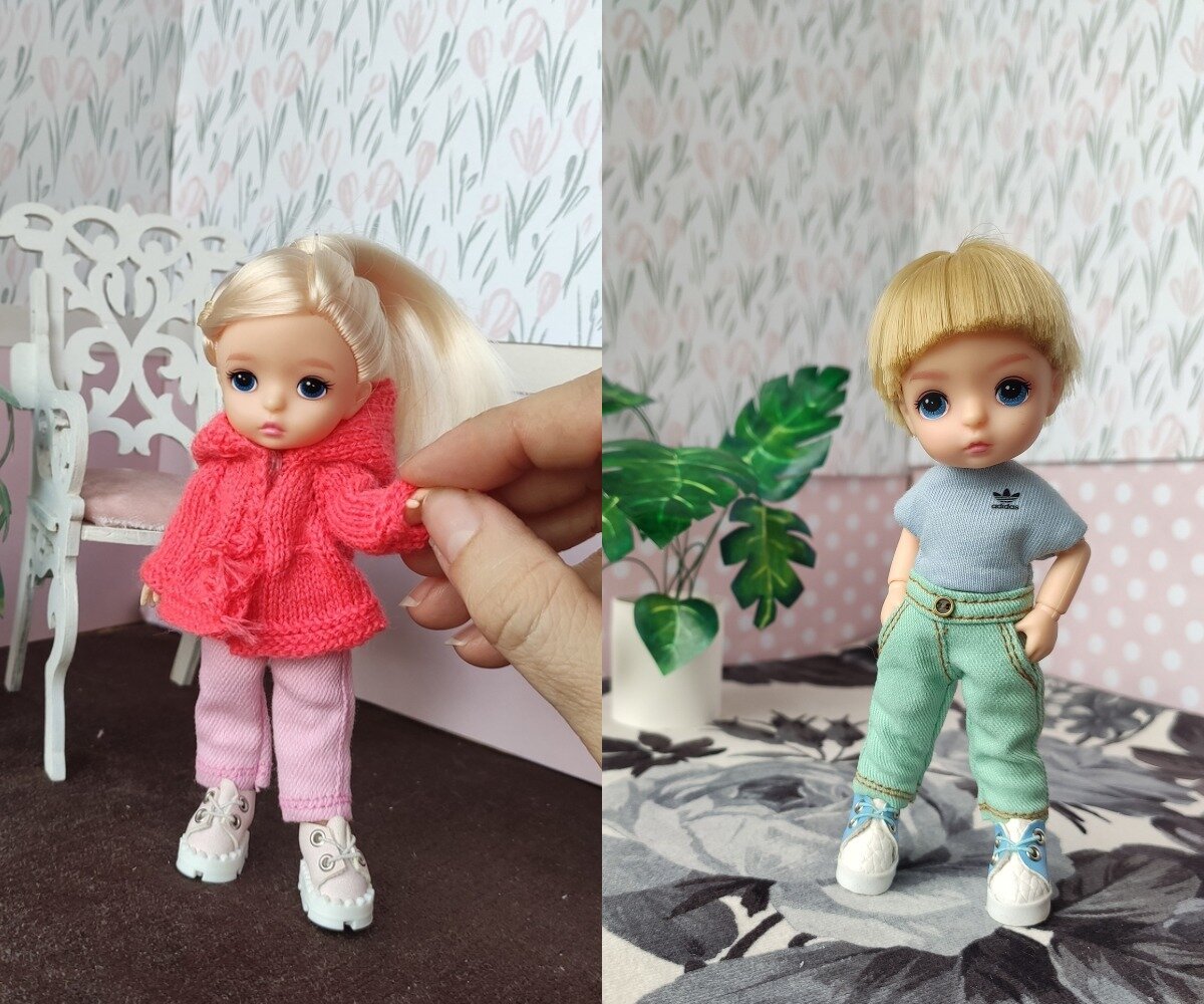 Приветствую всех, сегодня я снова с шарнирными малышами 13 см. Оказывается я совсем забыла выложить выкройку джинсов ( и маечки заодно) а ведь фото для МК отсняла еще прошлым летом... Да... и так бывает, но лучше поздно чем никогда. Итак, сегодня речь пойдет вот об этих малышах Костюм для мальчика Женьки шился когда-то на заказ ( для заказа жмем сюда), осталось только фото, а вот малышку-крутышку я решила побаловать новым комплектом, чтобы можно было смело идти покорять мир Джинсы с карманами, вполне функциональными, правда лапки туда засовывать все равно не очень удобно, но это мелочи И куда же без теплого кардигана Ну а шить сегодня мы будем джинсы с майкой Выкройку вы найдете в конце статьи, так что кому не интересны пояснения - смело листаем в самый конец Майку шью на подкладке из тонкого фатина ( у меня вообще остатки от тонкой тюли подруга подогнала) он не дает большой толщины, что идеально для такого размера кукол, и при этом все швы спрятаны и зафиксированы Переводим выкройку