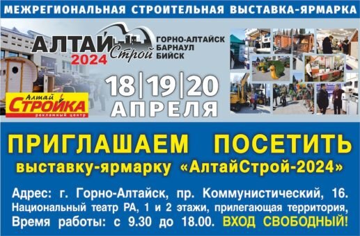 18 апреля открывает свои двери межрегиональная выставка-ярмарка «АлтайСтрой-2024». Приглашаем всех в Национальный театр Республики Алтай, 2 этаж, 1 этаж – два зала, улица!