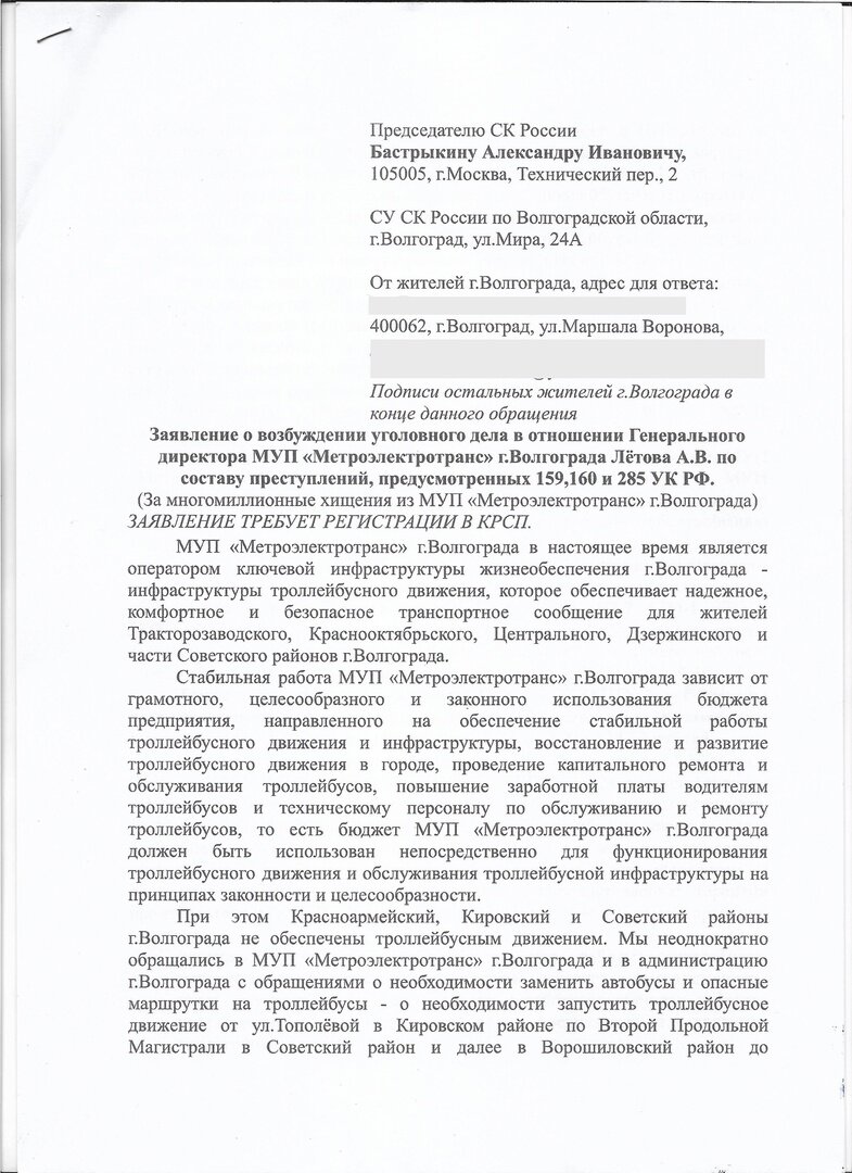 Жители Советского района Волгограда направили председателю СК России Александру Бастрыкину коллективное заявление о возбуждении уголовного дела отношении генерального директора МУП «Метроэлектротранс» Андрея Лётова.