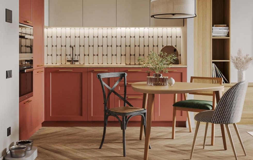 В этом проекте дизайнеры не побоялись сочных, сложных ярких цветов. Здесь зелено-синяя прихожая, терракотовая кухня, синий диван, который просматривается из прихожей. Спальня с ее благородным серо-зеленым цветом стен и розовой кроватью — смело и свежо.