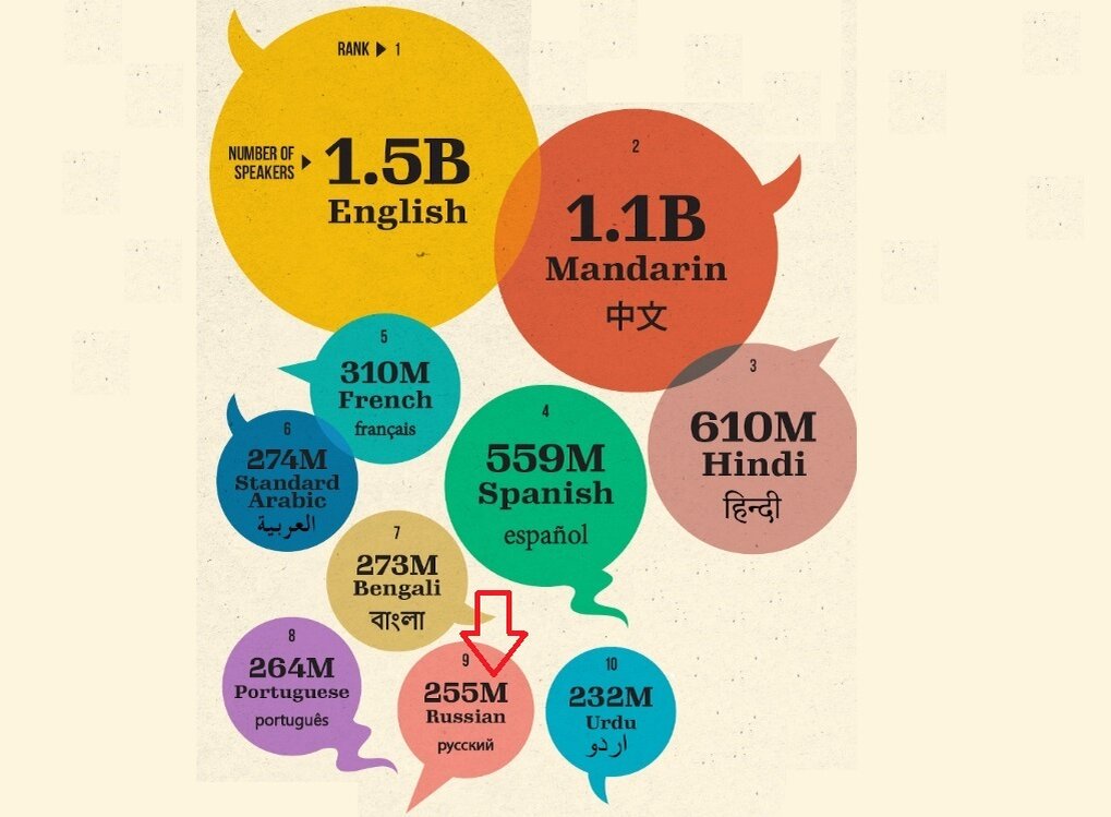 На нашей планете огромное количество культур и языков. В мире более 50 языков, на которых разговаривают миллионы людей, а знания хотя бы нескольких основных, очень пригодятся в путешествиях. 1. Английский. На нем разговаривает более полутора миллиарда человек во всем мире, а количество носителей постоянно растет. Этот язык считается международным. Кроме Великобритании, на английском языке разговаривают в 70 странах мира. 2. Китайский язык, на котором разговаривает 1.1 миллиарда человек. Это один из древнейших языков мира и один из самых сложных языков для изучения, состоящий из 4 тонов различного значения. 3. Язык хинди или попросту индийский масштабирует быстрыми темпами. Сегодня на нем разговаривает 610 миллионов человек. 4. Испанский язык почти 559 миллионов пользователей. Сегодня этот язык наряду с английским стремятся изучать во всем мире. Практически все латиноамериканские страны разговаривают именно на нем. 5. Французский язык с 310 миллионов носителей. Этот интересный язык и п