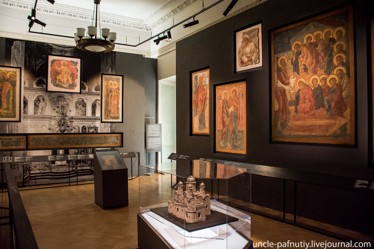 Экспозиция Музея архитектуры посвящена, с одной стороны, истории разрушенного калязинского Троице-Макарьевского монастыря, с другой - деятельности Музея по спасению и реставрации уникальных росписей. Фрески, выбранные для экспозиции, включают в себя ветхозаветные сюжеты, апокрифический цикл о рождении Богородицы, сцены из христологического цикла и Апокалипсиса, а также изображения святых князей. В частности, публике будут показаны ктиторские прижизненные портреты Алексея Михайловича и Марии Ильиничны, фрагменты летописей, орнаменты, фрески «Изгнание из Рая», «Строительство Вавилонской башни», «Новый Иерусалим», «Омовение ног», «Конь бледный и вороной», «Спас на престоле» и другие.