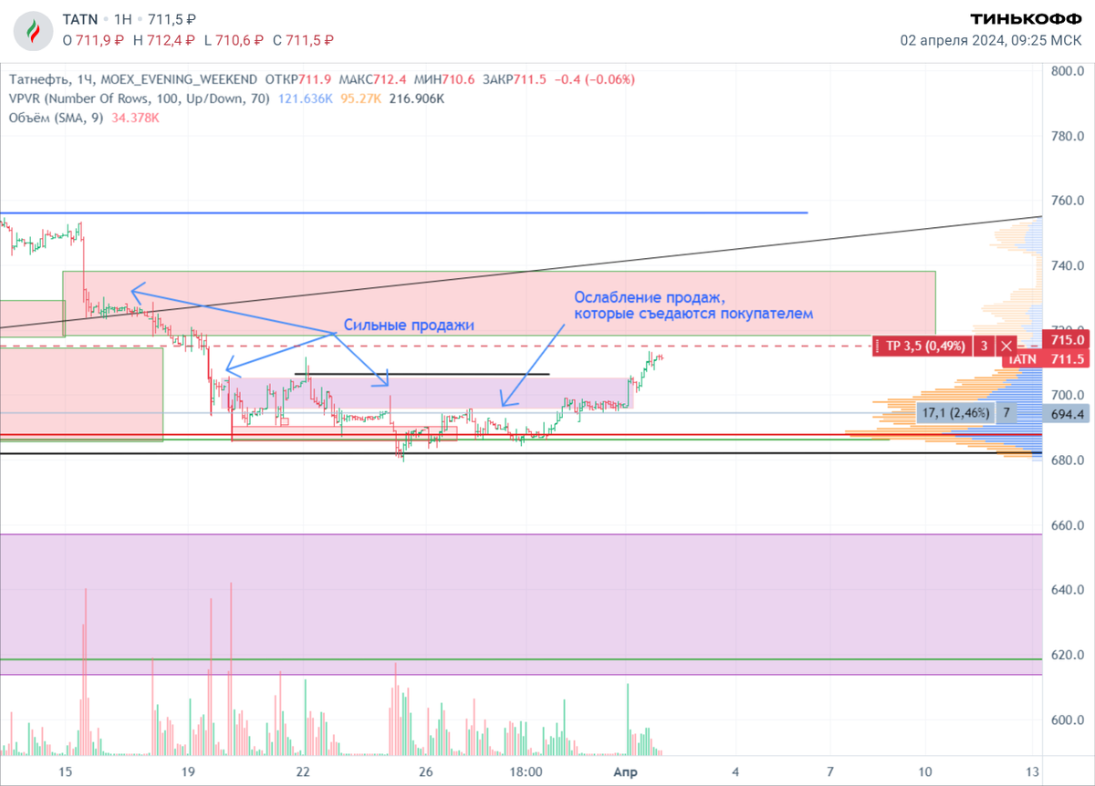 Продолжаю серию статей с сопровождением позиции в акциях Татнефти. Предыдущую статью с сигналом об ослабление волны продаж можно почитать тут Вчера (1 апреля 2024) произошел слом нисходящей тенденции волны продаж. Этому предшествовавало ослабление продавца из предыдущей статьи. Сегодня ожидаю двух сценариев: 1) Цена сразу с открытием рынка дойдет до зоны продавца на уровне приложения большого объема в волне продаж (в диапазоне 715-730), и будет возобновление продаж от этого уровня (хорошее или плохое возобновление будем оценивать потом по факту), либо 2) Цена опустится тестировать пробитый уровень последнего максимума, который обновлял минимум (в диапазоне цены 706-701 руб). Подписывайтесь на канал и следите за моим сопровождением позиции и разбором возможных ошибок.