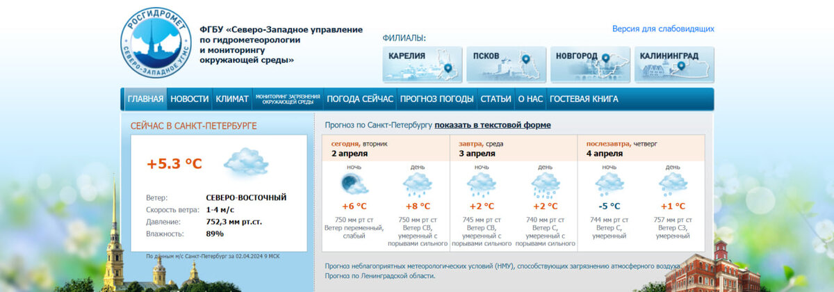 «Патриция» пугает. Погода в Петербурге особенно испортится к вечеру, а потом — снег, гололёд и ледяной дождь На схеме ФГБУ «Северо-Западное управление по гидрометеорологии и мониторингу окружающей среды» — целый ассортимент осадков в прогнозе на ближайшие три дня в Петербурге. Начнётся с дождя, а закончится снегом. 2 апреля, по прогнозу СЗ УГМС, в городе облачно с прояснениями, во второй половине дня дождь. Ветер восточный, северо-восточный переменный, местами порывы до сильного. Температура воздуха днем составит плюс 7–9 градусов. На погоду в регионе влияет северо-восточная периферия циклона, центр которого в середине дня окажется над Прибалтикой. Немецкие метеорологи назвали его «Патриция» (Patricia). Именно из-за его плотных облаков и сильного ветра снизится дневной прогрев. Атмосферное давление будет падать и составит 745 мм рт. ст., что существенно ниже нормы, сообщает центр «ФОБОС». В среду ещё интереснее. Осадки местами сильные: ночью в виде дождя, днем — дождя, переходящего в м