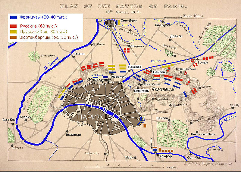 В те времена Париж был самым населённым городом Европы (более 700 тысяч жителей). С трёх сторон он был «прикрыт» водами Сены, а с четвёртой природными возвышенностями. Его защищал гарнизон в 40 тысяч солдат при 150 орудиях. Защитники были готовы отстаивать город до подхода основной армии Наполеона, застрявшего на севере Франции. Медлить со штурмом было нельзя. Согласно плану войска союзников расположились следующим образом. На правом фланге русско-прусские части во главе с Блюхером, слева соединения под командованием принца Вюртембергского, в центре русские войска Раевского. Центром и правым флангом командовал Барклай Де Толли. Общее руководство штурмом также было возложено на него. Этот русский полководец шотландского происхождения играл одну из ведущих ролей многих сражений Первой Европейской войны. Закономерно, что ему выпала честь её завершать.