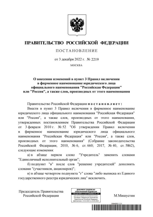 К такому выводу приходят некоторые граждане нашей страны... Так ли это? Многие граждане в силу отсутствия образования в юриспруденции и своего слабого среднего образования, а в данном случае русского языка, а также в силу спешки при прочтении того или иного текста закона, подзаконного акта неправильно его понимают, поспешно, однобоко и субъективно делают вывод, не подвергая его оценки, скрупулёзному анализу, принимаются за распространение этого вывода. В результате чего, среди определённого круга людей возникает в корне неверное понимание, а в последующем толкование, обсуждаемого того или иного закона, нормативного акта. В данном случае рассматривается Постановление Правительства РФ №2219 от 3 декабря 2022 г. "О внесении изменений в пункт 3 Правил включения в фирменное наименование юридического лица официального наименования "Российская Федерация" или "Россия", а также слов, производных от этого наименования" (далее по тексту - ПП РФ №2219) Определённая категория выше указанных гр