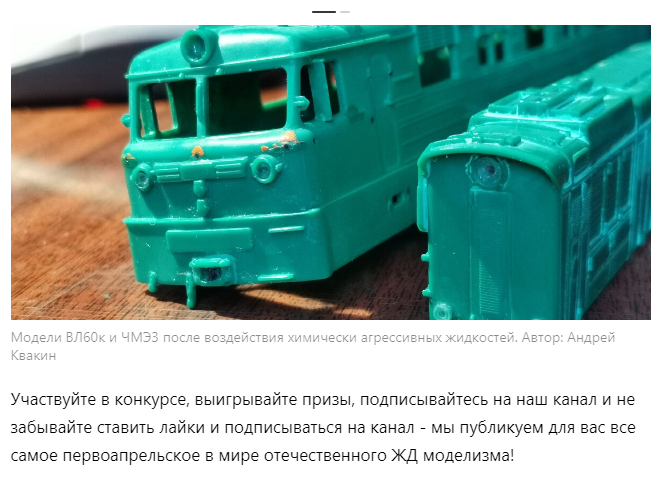 Как известно, 1 апреля - международный день смеха. Кто-то называет его еще "днем дураков" (даже в Википедии в скобках так и пишут). Ну тут уж кто на что учился, как говорится ;) ЖД моделисты, как народ не чуждый всему земному, традиционно отпраздновали 1 апреля, сдобрив порции новостей в пабликах различными шутками и приколами. Большинство из них было воспринято адекватно и спокойно, и многие пользователи разоблачили шутников. Но какая то часть оказалась недовольна тем, что их разыграли, некоторые даже пришли в ярость. Хм... может быть поэтому у дня смеха есть и второе название? Розыгрыш от канала "Железнодорожный моделизм" Канал "Железнодорожный моделизм" не оказался в стороне от веселых розыгрышей и опубликовал новость о том, что запускает новый конкурс. Суть конкурса сводилась к тому, чтобы сделать максимально плохо любой из моделей серии "Наши поезда" и прислать фотографии того, что получилось на оценку жюри. Новость была опубликована не только на канале в Дзене, но и в ряде паблик