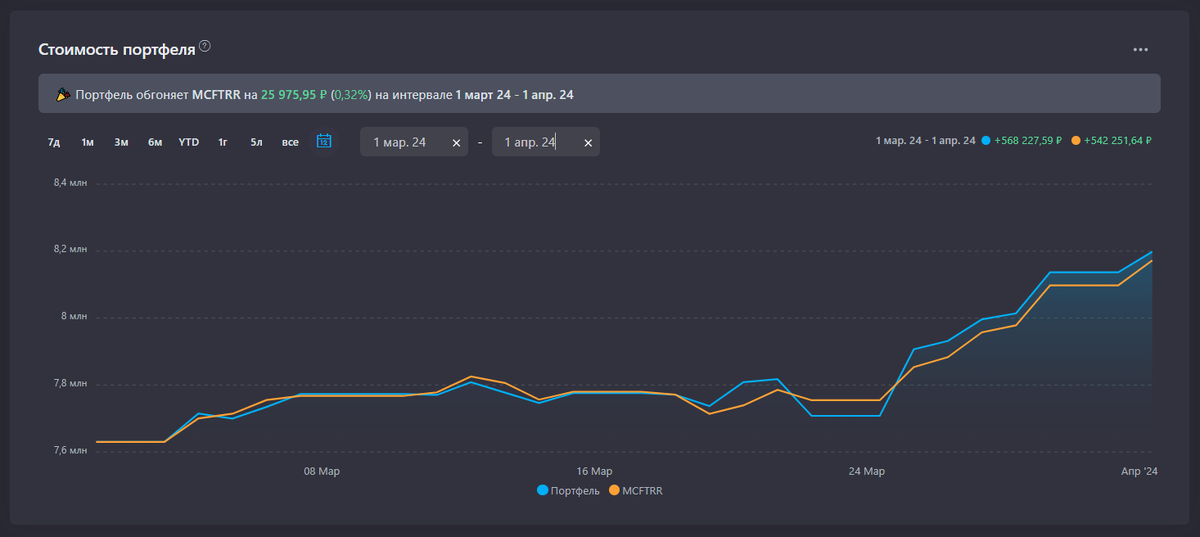 Я взялся за самостоятельное управление семейными накоплениями, и получается у меня гораздо лучше, чем у профессионалов в пенсионных фондах. Март был неплохим месяцем. Прирост активов составил +1,4 млн ₽ за месяц. А с начала года прирост +3,72 млн ₽ или +13%. В этой статье я расскажу, что делал в марте. 1). Российские акции Покупки: +300 700₽. Продажи: 0₽. Дивиденды: 0. Без учета покупок, сами акции приросли на 268 тысяч рублей. Свое собственное "умное" управление позволяет уже который месяц подряд иметь результат чуть лучше, чем у индекса Мосбиржи. Портфель обогнал индекс ещё на 26 тысяч за месяц. Купил акции 18 компаний из индекса Мосбиржи. Продаж нет, дивидендов не было. Была отсечка по дивидендам в Новатэке, но сама выплата (чуть больше 10 тыс. рублей) поступит в апреле.