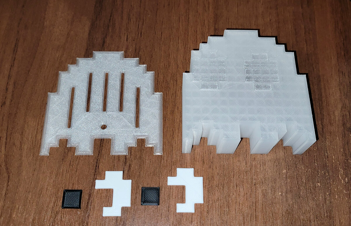 Всем привет. Настало время прервать очередное затишье на канале. Поводом для этого послужит тема, которой ранее не касался, а именно 3д печать. Скорее всего было бы логичнее начать с основ, но о них как-нибудь потом, сейчас же сразу приступим к практике. Ссылки на расходники и прочую сопутствующую информацию приведу в самом конце. Ролик с готовым результатом уже был выложен накануне: https://dzen.ru/video/watch/660bd0e180a89205d047eb55?share_to=link В очередной раз листая thingiverse.com (один из крупнейших ресурсов, посвященных 3д моделированию), наткнулся на данную модельку https://www.thingiverse.com/thing:6247168, представляющую собой ночник в виде призрака из легендарного ПэкМена. К слову, в игре за нами охотятся всего 4 призрака, у каждого из которых есть свое имя: Блинки, Пинки, Инки и Клайд. Идея мне показалась интересной, решил ее воплотить в жизнь. Для начала распечатал все элементы модели, коих всего 6 штук: сам корпус, задняя стенка и по 2 штуки белков и зрачков глаз призра