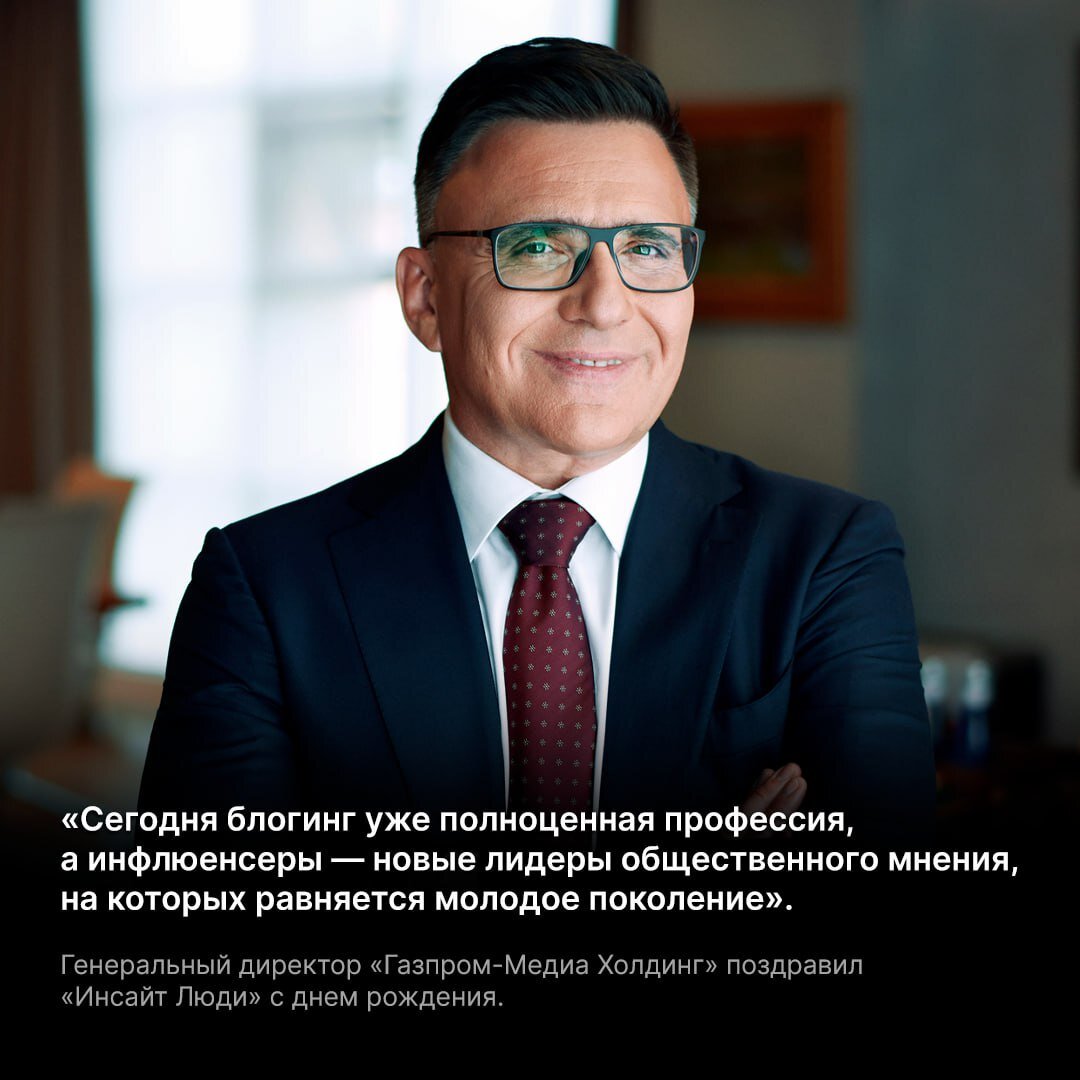 Генеральный директор «Газпром-Медиа Холдинг» Александр Жаров поздравил нас с днем рождения и пожелал уверенно идти к новым победам и покорять вершины: «Нашему новому активу, который недавно пополнил большую дружную семью «Газпром-Медиа Холдинга», — продюсерскому центру «Инсайт Люди» — исполняется три года. За это время «Инсайт Люди» стал точкой притяжения креативного класса России, создав регионально-интегрированную инфраструктуру по всей стране, открывшую социальный лифт для творческой молодежи. Сегодня блогинг уже полноценная профессия, а инфлюенсеры — новые лидеры общественного мнения, на которых равняется молодое поколение. И тем больше ответственность авторов контента перед их аудиторией: они создают ролевые модели поведения для молодежи, продвигают в социальных сетях традиционные ценности, достижения российской науки и культуры, развивают патриотические чувства. Я желаю команде «Инсайт Люди» достойно продолжить начатое, уверенно идти к новым победам и не бояться покорять новые в