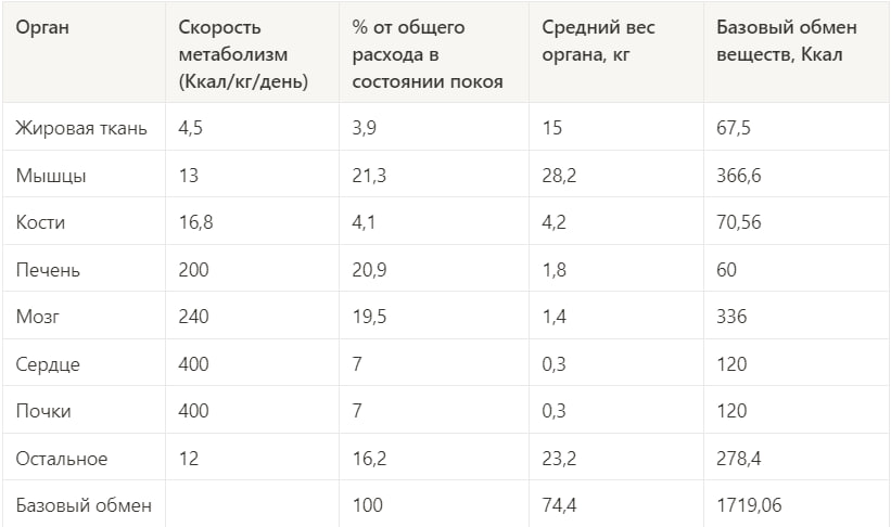 И 70-80% энергозатрат приходится на органы, которые занимают не более 7% от общей массы тела. В то же время, мышцы могут занимать около 40% от общей массы тела, но в состоянии "покоя" расходуют 20% всей энергии.