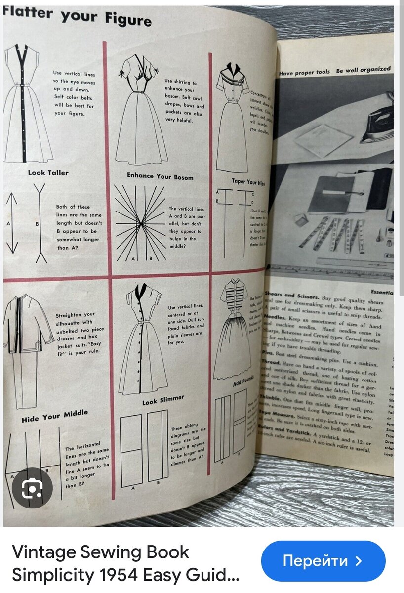 Как польстить фигуре. Несколько полезных советов. Оригинальные страницы из книги. Я сделала перевод того, что видно. Vintage Sewing Book Simplicity 1954 "Easy Guide For Beginners and Experts". 1) Выглядеть выше