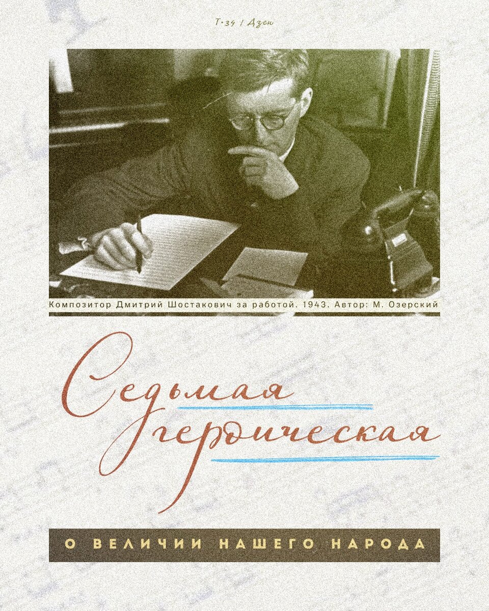 Последние предвоенные годы для Дмитрия Дмитриевича Шостаковича были очень плодотворными. Шестая симфония, фортепьянный квинтет, музыка к фильмам «Выборгская сторона», «Великий гражданин», «Человек с ружьём» принесли композитору успех. И он задумывает написать монументальную симфонию памяти В. И. Ленина. Однако война сорвала его планы. Композитор решает остаться в осаждённом родном своём Ленинграде. В одежде пожарника дежурит он на крыше дома, а как только стихает грохот бомб и вой сирен, снова погружается в работу с лихорадочной энергией. Он создаёт Седьмую симфонию, симфонию — «о наших людях, которые становятся героями, которые борются во имя торжества нашего над врагом... о величии нашего народа... о нашей прекрасной природе, о гуманизме, о красоте...» Посвящает её композитор героическому Ленинграду. Седьмая симфония, так называемая Ленинградская, была впервые исполнена в дни напряжённейших боёв с врагом — в марте сорок второго года. «Симфония всепобеждающего мужества», «Симфония гне