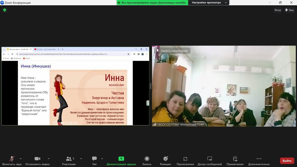 Волонтёры онлайн-группы Иловатского ПНИ давно собирались поговорить об именах подопечных: что каждое имя означает и какова его история. А еще было интересно поговорить о ласковых и необычных вариантах каждого имени. - Оказалось, что Лена любит, когда ее называют Леночкой, - рассказывает координатор группы Екатерина Полякова, - а Наташе нравится такой немного экзотический вариант, как Натали! Выбирая тему встречи, мы всегда стараемся превратить ее в диалог, а собранный материал - в повод для общения и обмена впечатлениями с нашими подопечными. Так и разговор об именах стал поводом вспомнить любимых актеров и певцов, послушать песни и посмотреть клипы знакомых исполнителей. Например, по удивительному стечению обстоятельств наша Инна больше всего любит англоязычную певицу из Румынии по имени Inna. Она не очень известна в нашей стране, но нам удалось найти несколько ее интересных клипов. Это был повод вспомнить и любимые фильмы, посмотреть отрывки из них, ведь девушки и женщины Иловатского