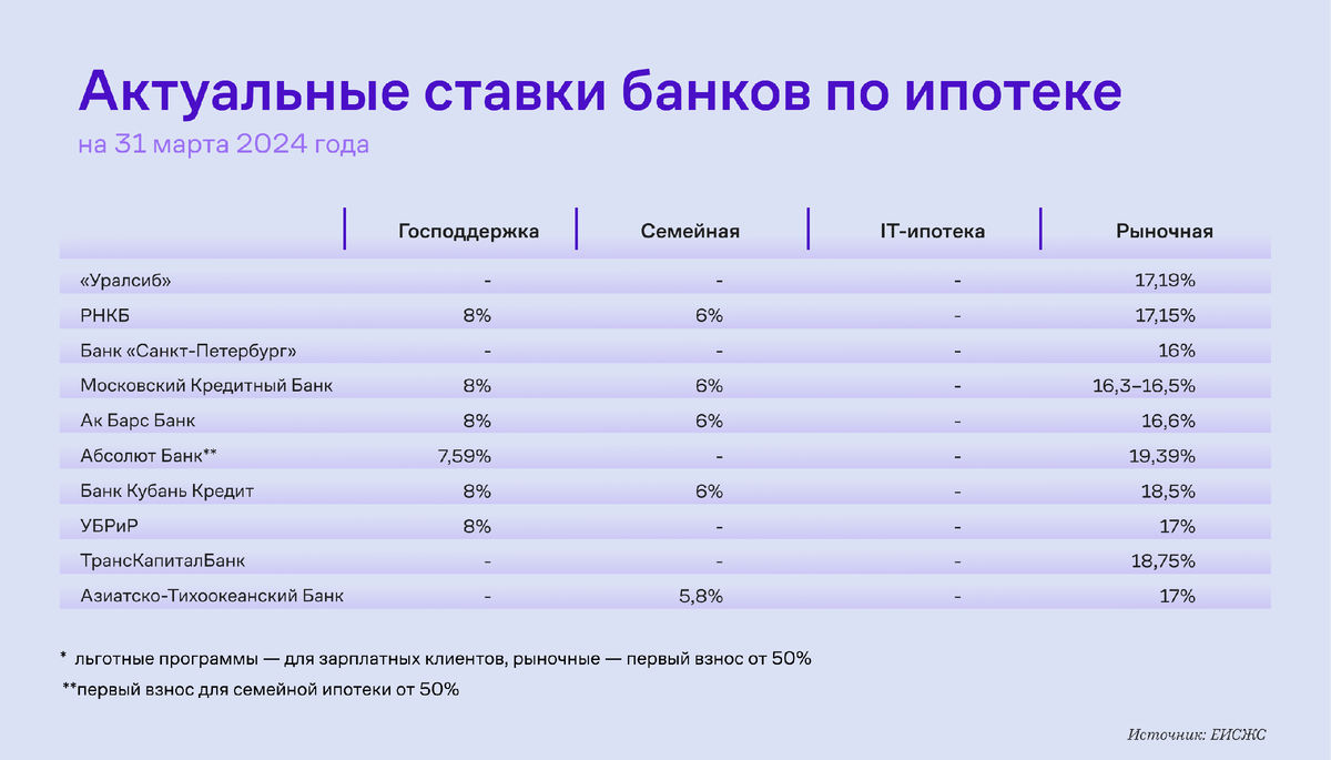 Собрали список актуальных ставок по ипотеке в топ-20 ипотечных банков России Хотя ЦБ в марте не поменял ключевую ставку, условия по ипотеке за последние месяцы немного изменились. Например, по сравнению с нашим последним мониторингом немного выросли ставки по рыночной ипотеке: 🟣 у «Дом.РФ»: с 15,6% до 16,6% 🟣 у Газпромбанка с 17,5% до 20,1% Кроме того, перестал выдавать ипотеку по льготным программам банк «Санкт-Петербург», а Московский кредитный банк, наоборот, возобновил выдачи. Данные основаны на мониторинге единой информационной системы жилищного строительства и данных банков.