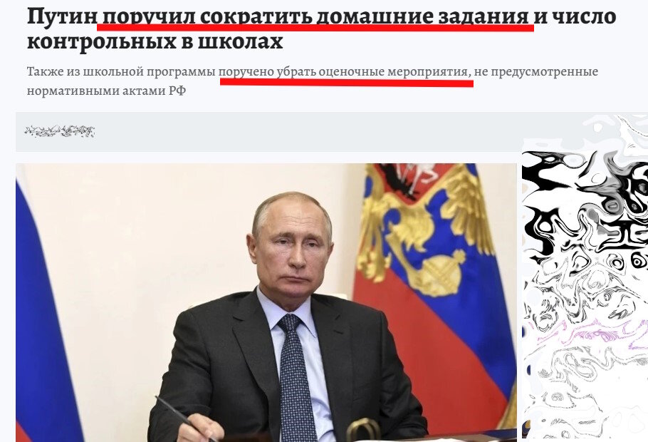 Вчера все информагентства и издания подхватили весть о том, что будут сокращать домашние задания и уберут контрольные работы. Мол Путин подписал распоряжение. Кто-то пишет мол сократить домашние задания и убрать контрольные. Кто-то пишет мол оптимизировать, но сократить домашние задания и убрать лишние контрольные работы. Кто-то просто уменьшить домашнюю работу. А вот что написано на самом деле: И знаете, журналисты ухватили самую суть, как бы Михаил Богданов не говорил, что нет этого в поручении. Но мы имеем дело с государственными институтами. И Минпросвещения, и Рособрнадзор - его самые высшие представители. Что нас ожидает на самом деле? Первое, на что хочу обратить внимание, это то, что в школе нет ни одной лишней контрольной работы? Большой раздел пройден - контрольная обязательно. Отсюда уже понятно, что исключить таковые невозможно с точки зрения учителя в принципе, ведь они уже в программе прописаны, плюс контрольные в конце четверти, и, так называемые административные. Второ