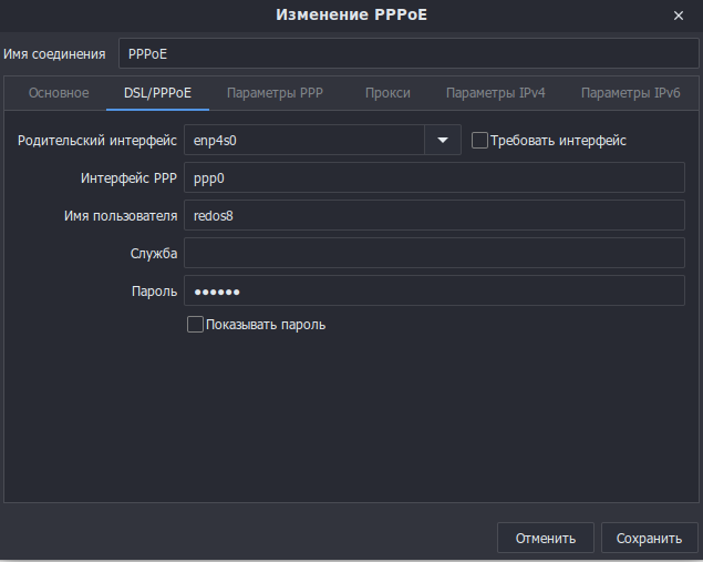 Столкнулся с проблемой PPPoE соединения в этой Оси. Решение в следующем. Создаем подключение: во вкладке Основное ставим чек на подключаться автоматически с приоритетом 0 и все пользователи могут подключаться к этой сети. По желанию можно отключить IPv6 в последней вкладке. Переходим к локальному интерфейсу. У меня используется DHCP. Переходим в маршруты. Тут жмем добавить и указываем сети маски и маршруты иных подсетей вашей локалки и главное, ставим два чека как указано. После этого перезагружаемся и видим что подняты интерфейсы локалки и PPPoE. Дефолтовым маршрутом идет PPPoE, и при этом локальная и соседние сети так же доступны. Профит. З.Ы. Если требуется временные подключения-отключения PPPoE, в таком случае чек "подключаться автоматически" убираем, в консоли от пользователя даем команду nmcli c . Смотрим, как обзывается соединение с интерфейсом ppp0. Мое PPPoE соединение так и называется. Теперь даем команду `nmcli c up PPPoE` для подключения или `nmcli c down PPPoE` для отключ