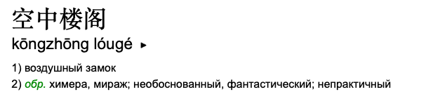 А что за история с китайским 空中楼阁 kōngzhōng lóugé "воздушные замки"? Полагать, что и здесь – французское влияние, было бы по меньше мере странно. Во-первых, китайское выражение старше французского веков на одиннадцать и изначально происходит из "Исторических записок" (史记, shǐ jì) знаменитого историографа династии Хань Сыма Цяня (司马迁, Sīmǎ Qiān, 145 или 135 – 86 гг. до н.э.): “海旁蜃气象楼台,广野气成宫阙然。” – "Миражи над морскими берегами – словно воздушные дворцы". Но это скорее поэтично, нежели иронично.