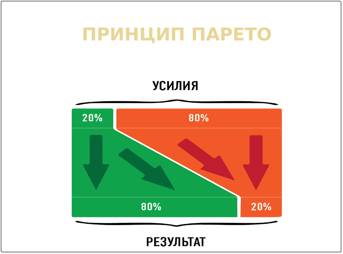 Принцип Парето - правило названное в честь экономиста и социолога В. Парето. формулируется как «20 % усилий дают 80 % результата, а остальные 80 % усилий - лишь 20 % результата». Правильно выбрав минимум самых важных действий, можно быстро получить значительную часть от планируемого полного результата, при этом дальнейшие улучшения неэффективны и могут быть неоправданны.
