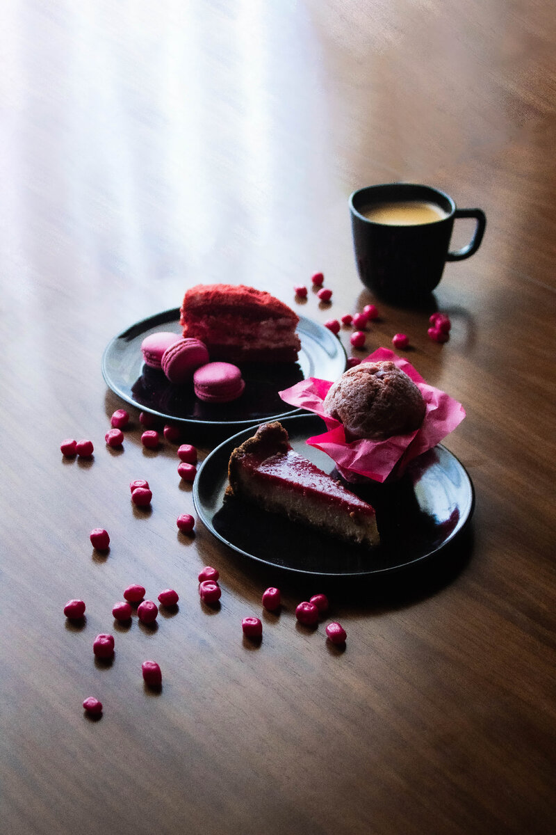 Есть у меня в загашниках съемка, которая мне нравится до сих пор. НО! Но есть там момент, от которого дергался глаз у меня жутчайше. Так что это повествование о том, как я закрываю свои фото гештальты. Мне хотелось снять что-то сладкое, с контрастными цветами и жесткими тенями. И не давал покоя набор темной посуды. Готовить было лениво, поэтому пошли мои рученки по доставкам. Остановилась на десертах, вот как будто производители заморачиваются о сладком больше других продуктов. Откуда я заказала сладости в кадр, я уже и не помню. Просто напихала чего-то в цветах черного и розово-красного. Здесь можно вставить шутку о моем 2007, да-да, но выбор пал на такую гамму исключительно из-за того, что ягоды – популярный вкус, так что и красно-розового в десертных делах много. А темное, скорее к посуде сыграло. Хотя, я в принципе тяготею к темным гаммам куда сильнее светлых-пастельных. Собственно, суть не совсем в композиции и продуктах. Кусок штор в карде, заставляет меня буквально хотеть биться