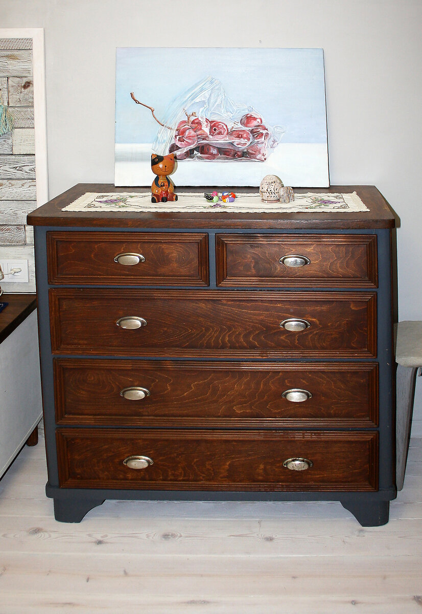 Этот комод одно из моих ложных воспоминаний. Я выросла в деревне у бабушки. Но, к сожалению, ничего от тех времен не осталось кроме вышитой салфетки, которая теперь лежит на нем. И кажется, что это комод из детства... А купила я его в 2018 году на авито. Хотелось что-то побогаче с точеным декором, но попался вот такой. Зато всего за тысячу ) Столешница была окрашена половой краской. По фото из объявления показалось, что и фасады ящиков тоже покрашены, но это оказался плотный лак. Отмыла, потом несколько дней снимала краску, лак и морилку. Это практически была моя первая крупная работа, многое не знала. Снимала покрытия шлифмашинкой. Потратила на это кучу времени и сил, но комодик получился чистенький! Сделала мелкий ремонт сколов, устранила кривизну ящиков подклейкой деревяшек к стершимся снизу полозьям. Всю внутренность кроме задней стенки из ДВП покрыла спиртовой морилкой для оздоровления древесины и устранения затхлого запаха. Каркас комода покрасила акриловой краской. Мне показал