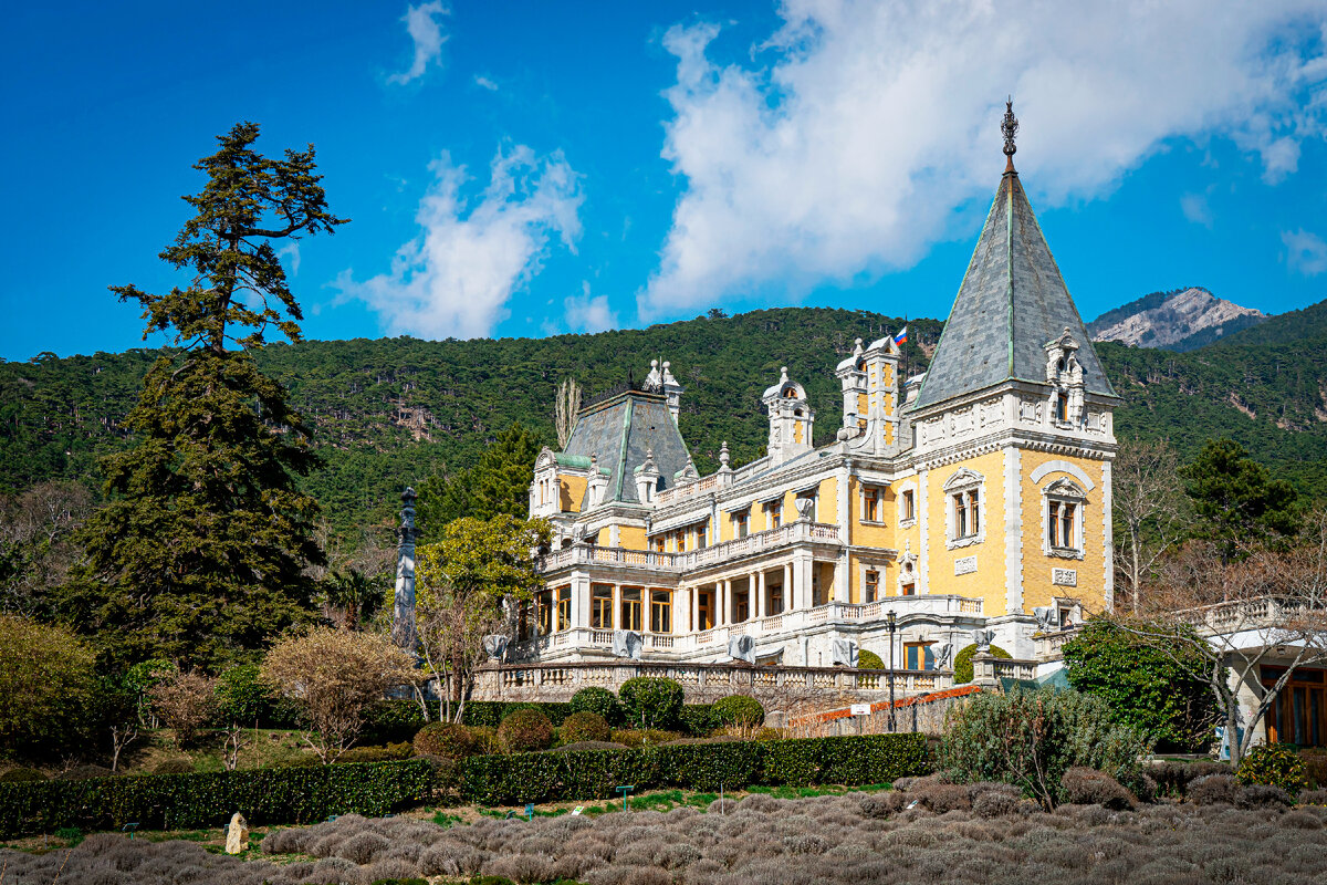 Крыша дворца стреловидная и куполообразная, он украшен множеством копий античных статуй, всяческих малых архитектурных форм. Частично прослеживается мавританский стиль, который подчеркивают стилизованные под минареты трубы и резные украшения. Хотя в основном, это стиль шатоэск, возникший во Франции в 16-17 веках. Название это происходит от французского слова «шато». Сложно, замудрено, но красиво. У них таких и сейчас много в долине Луары. А еще, эклектично, что как раз соответствует этому стилю. Особенно, на фоне живописного и тяжеловатого хребта Никитской яйлы.