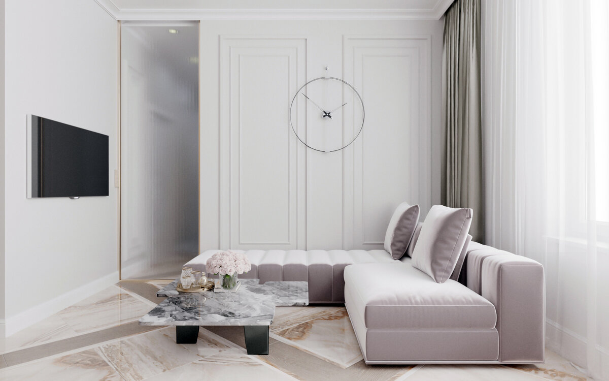 Интерьер в стиле неоклассика с романтичной гостиной в ЖК "Перово"